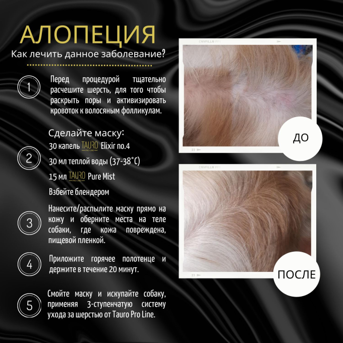 Используйте в сочетании с косметическими средствами для усиления их эффекта. Для наружного применения распылить на шерсть или кожу 2-4 раза.